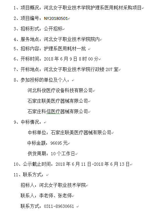 河北女子職業技術學院護理系醫用耗材采購項目中標公告