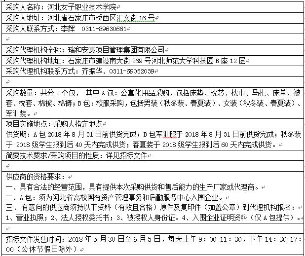 項(xiàng)目名稱(chēng):河北女子職業(yè)技術(shù)學(xué)院公寓化用品及校服采購(gòu)