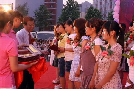 盛典的第一項環節是2010屆畢業典禮。王振杰院長首先宣讀了《關于2010屆1509名畢業生準予畢業的決定》,并親自向畢業生代表頒發了畢業證書和象征事業順利、家庭和睦、愛情甜蜜的幸福花環;柳韶軍副院長為“省、校兩級優秀畢業生”和“優秀實習生”代表頒發了榮譽證書;王靜書記發表了熱情洋溢的致辭,向圓滿完成學業,順利畢業的1509名畢業生表示熱烈的祝賀,向精心育才、辛勤付出的教職員工表示衷心的感謝。同時,她希望廣大畢業生能夠傳承中華民族傳統美德,踐行社會主義核心價值體系,胸懷使命,志存高遠,在不斷奮進中實現自己的人生價值,并鼓勵同學們樹立終身學習的理念,勇于克服困難,錘煉意志、歷練品德,真正成為腳踏實地、勤于學習、善于創造、甘于奉獻的有用之才。
