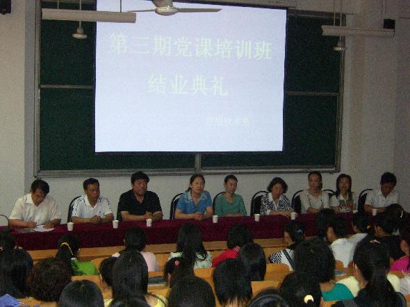 應用技術系李志主任匯報了培訓班教學、討論和結業考試的情況。本期培訓班在2008年12月12日開班,到5月22日結業,經歷了5個多月的時間,采取集中培訓和自學相結合的形式,共有279名思想進步學員接受了黨的基本知識和基本理論培訓。培訓結束后,經過認真考核和考察,根據黨課培訓總評成績,有270名同學順利結業,其中95名同學確定為優秀學員。在這次培訓班上學員們學習了《黨章》、“十七大會議”的重要精神、黨的基本知識、科學發展觀重要理論等。結業典禮上,邊超寧同學作為優秀學員代表做了激情洋溢的心得體會交流發言。