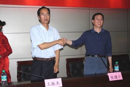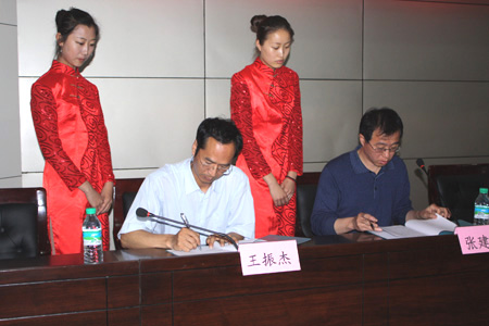 在學(xué)院學(xué)術(shù)報(bào)告廳,學(xué)院院長(zhǎng)王振杰與際華3502職業(yè)裝有限公司人力資源部部長(zhǎng)張建中簽署了校企合作協(xié)議書(shū)。