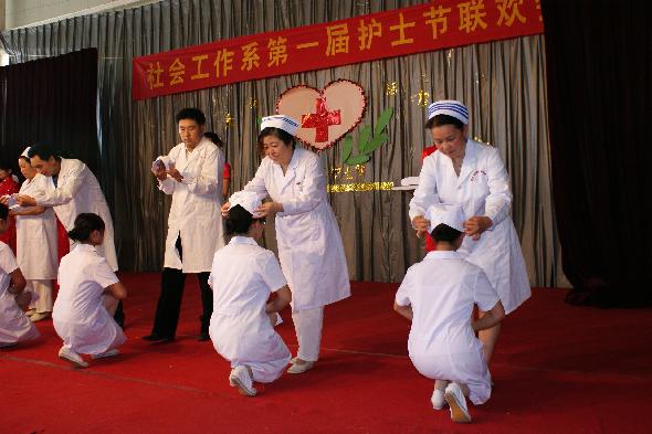 為深入貫徹落實科學發展觀,弘揚南丁格爾精神,外塑護理專業形象,內塑護士職業素養, 2009年5月12日,社會工作系隆重舉辦護士節慶祝活動。河北醫科大學王桂英教授、張邊江教授、王懷福教授、和平醫院婦產科張進護士長、石家莊市第一醫院護理部任慶茹主任、武警總隊醫院護理部李麗女士、卓達高級職業培訓學校郭鐵海校長、河北醫藥藥材大廈市場部魏惠麗經理、河北裕康醫療器械公司張靜經理等9位專家作為護理專業建設指導委員會委員,應邀出席慶祝活動。我院黨委書記王靜同志、王振杰院長、教務處處長徐愛新同志、學生處處長董海鷹同志、組宣處處長胡會來同志、社會工作系主任胡英娣同志參加了本次活動。