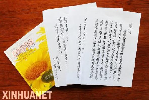 都江堰中小學生簽名畫集贈總理 溫家寶給孩子們親筆回信予勉勵。在四川汶川特大地震發生一周年之際,四川省都江堰市156名中小學生代表全市中小學生給國務院總理溫家寶寄來他們簽名的畫集《美麗的花朵》。近日,溫家寶總理給都江堰市全市中小學生親筆回信,感謝這些災區孩子們簽名寄贈的畫集《美麗的花朵》,勉勵他們“要以堅忍不拔的意志努力做一個有用的人,去幫助人們過上更好的生活?!边@是溫家寶總理親筆回信手跡和《美麗的花朵》畫集。新華社記者樊如鈞攝