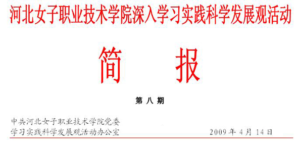 根據(jù)《河北女子職業(yè)技術(shù)學(xué)院開(kāi)展學(xué)習(xí)實(shí)踐科學(xué)發(fā)展觀活動(dòng)的實(shí)施意見(jiàn)》和《河北女子職業(yè)技術(shù)學(xué)院“萬(wàn)名教師訪萬(wàn)家”活動(dòng)實(shí)施方案》的工作要求,教工第二黨支部從創(chuàng)建“學(xué)習(xí)型、創(chuàng)新性、實(shí)干型、和諧型”處室入手,把打造一流的管理干部隊(duì)伍,樹(shù)立“勤奮、務(wù)實(shí)、創(chuàng)新、高效”的工作作風(fēng),全面實(shí)現(xiàn)“創(chuàng)新思路求發(fā)展,科學(xué)管理上水平,以人為本促和諧”作為活動(dòng)目標(biāo),在支部全體黨員干部范圍內(nèi)開(kāi)展了“強(qiáng)化工作職責(zé) 提高工作效能推動(dòng)學(xué)院科學(xué)發(fā)展”主題系列活動(dòng)。