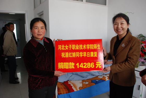 潘洪嬌同學3月19日入院,經檢查被診斷為紅斑狼瘡急性腎病綜合癥。若病情持續發展,將導致腎功能衰竭,患者會因尿毒癥和身體各器官全面衰竭而死亡。此病的治療需要昂貴的醫藥費,這對一個農民家庭來說無疑是巨大的災難。藝術設計系得知情況后,系團總支向全系教師和學生發出倡議,號召大家:少吃一塊雪糕、少去一次網吧、少逛一次街,節省零用錢,伸出援助之手,用愛心來挽救這個鮮活的生命。倡議書發出后,學院領導、老師和同學們、學院食堂和部分社會人士均伸出援助之手,迅速掀起了一股獻愛心熱潮,十天的時間募集到愛心款14286元。學院領導對此事非常重視,黨委書記王靜與藝術系老師們一起前往醫院看望潘紅嬌同學。