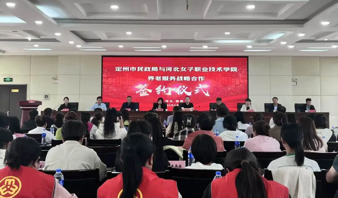 為深入推進養老服務人才培育工程,打造河北特色養老服務實訓基地,助力定州養老事業發展,5月11日下午,河北女子職業技術學院與定州市民政局舉行養老服務戰略合作簽約儀式。學院黨委書記麻士琦,院長王芳,黨委副書記范瀛立,副院長胡會來;定州市副市長邢偉濤,市民政局黨組書記、局長胡翠蓮,市民政局副局長李星,市民政局養老科科長張志峰等領導出席了本次儀式。定州市養老機構代表、養老護理員代表、融媒體記者150余人參加了簽約儀式。