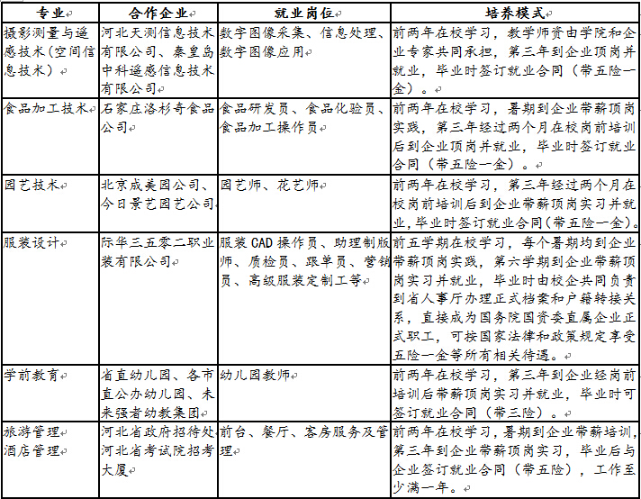 學(xué)院以“校企合作”、“訂單式培養(yǎng)”、“頂崗實習(xí)”等手段為推進學(xué)生就業(yè),根據(jù)企業(yè)生產(chǎn)實際、技術(shù)發(fā)展趨勢,調(diào)整專業(yè)設(shè)置、培養(yǎng)目標(biāo)和教學(xué)模式,依托地方經(jīng)濟發(fā)展開辟了校企合作人才培養(yǎng)模式,畢業(yè)生就業(yè)率居省內(nèi)同類院校前列。其中,服裝設(shè)計、學(xué)前教育、園藝技術(shù)、食品加工技術(shù)、攝影測量與遙感技術(shù)(空間信息技術(shù)方向)、航空服務(wù)、航海技術(shù)、輪機工程技術(shù)、輪機工程技術(shù)(電子船員方向)、港口機械應(yīng)用技術(shù)等12個專業(yè)實行“訂單式人才培養(yǎng)”,學(xué)生入學(xué)即可確定就業(yè)單位,就業(yè)率100%;護理、財務(wù)會計類、學(xué)前教育、金融保險、旅游管理等22個專業(yè)實行“校企合作”,分別與中國人民解放軍際華白求恩和平醫(yī)院、河北醫(yī)科大學(xué)第二附屬醫(yī)院、省教育廳、省教育考試院、省科學(xué)院果樹研究所、世界500強之一河北鋼鐵集團、省政府機關(guān)事務(wù)管理局、未來強者幼教機構(gòu)等近百家大型企業(yè)、事業(yè)單位簽署協(xié)議,就業(yè)率均在90%以上。